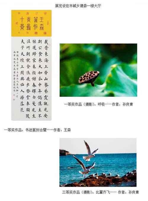 海川集團(tuán)員工在海川書(shū)畫(huà)攝影研究會(huì)的牽頭下積極參與此次展覽,創(chuàng)作精力充沛,在短短一周內(nèi)創(chuàng)作作品數(shù)十幅。展覽期間,主辦單位共收到各類(lèi)參展作品294幅,其中:書(shū)法類(lèi)作品83幅,繪畫(huà)類(lèi)作品65幅,攝影類(lèi)作品139幅,手工才藝類(lèi)作品7件。在此次展覽中海川集團(tuán)員工周天馬、丁磊、孫良青、楊興強(qiáng)、寧楊、王森的作品入展并在市城鄉(xiāng)建委一樓大廳展出。這些作品主題鮮明、風(fēng)格多樣。在展覽后評(píng)獎(jiǎng)中,孫良青攝影作品《呼吸》獲攝影作品一等獎(jiǎng),《比翼齊飛》獲三等獎(jiǎng);王森《書(shū)法篆刻合璧》獲書(shū)法類(lèi)一等獎(jiǎng)。