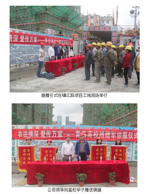 10月16日下午,由青島理工大學土木學院學生會牽頭組織,青島大學和中國海洋大學共同參加的“衣往情深,愛傳萬家”軍訓服捐贈儀式,在青島海川建設集團鎮(zhèn)江路項目工地隆重舉行。來自青島理工大學市北校區(qū)、黃島校區(qū),青島大學和中國海洋大學的學生組織代表出席了捐贈儀式,青島海川建設集團副總裁李尊強、團委書記王群、六分公司都市逸品項目部經(jīng)理劉峰官以及所在項目部分工人代表出席了捐贈儀式。