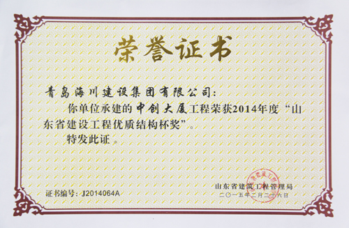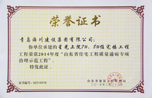 公司最近從省建筑工程管理局接連捧回四項省級榮譽證書,分別是:一分公司中創(chuàng)大廈工程榮獲“2014年度山東省建筑工程優(yōu)質(zhì)結構杯獎”,四分公司星光上院7#、8#住宅樓工程榮獲“2014年度山東省住宅工程質(zhì)量通病專項治理示范工程”。七分公司青島農(nóng)業(yè)大學新建科技實驗樓工程接連榮獲“2014年度山東省建筑施工安全文明標準化優(yōu)良工地”和 “2014年度山東省建筑工程優(yōu)質(zhì)結構杯獎”兩項榮譽。